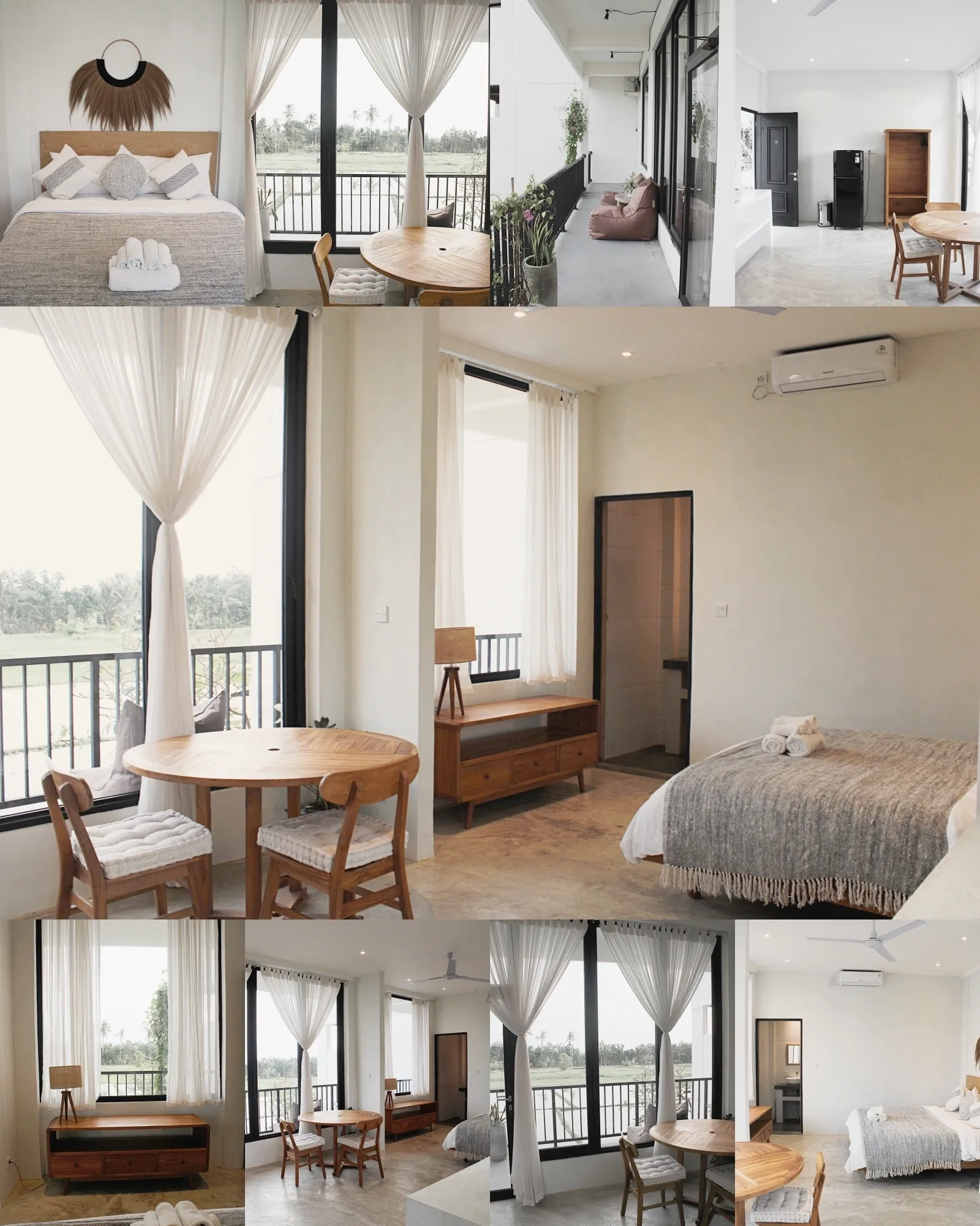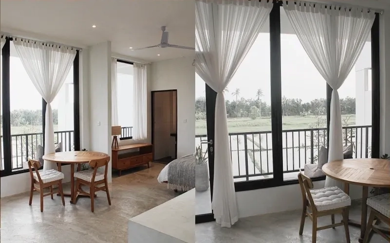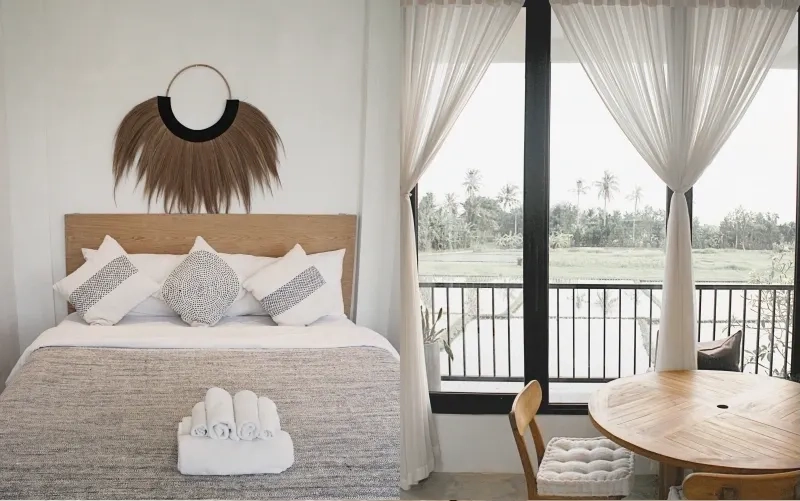 Large windows open up to peaceful rice field views, allowing natural light and fresh air to flow through throughout the day. Whether you are staying for a short getaway or a longer period, guests enjoy easy access to the pool, café, gym, and shared spaces — all just minutes from the ocean.